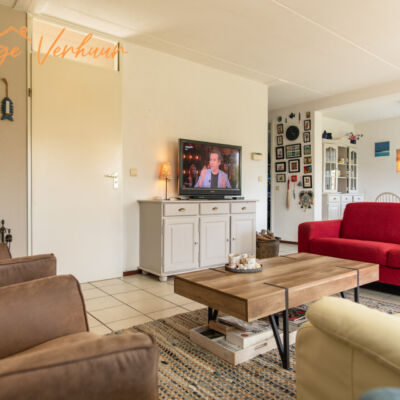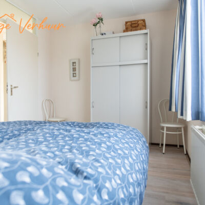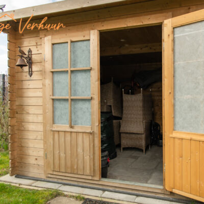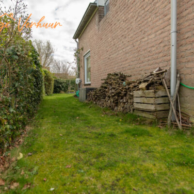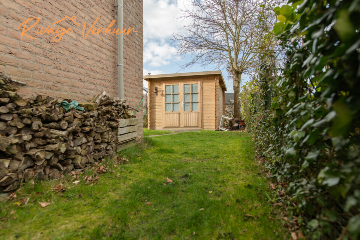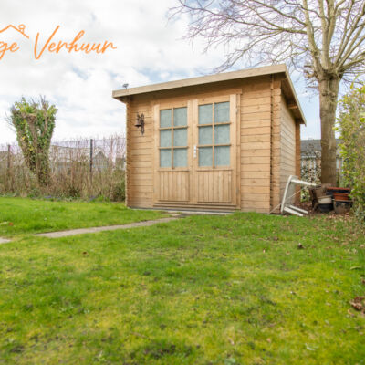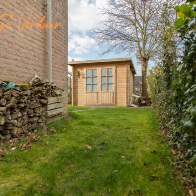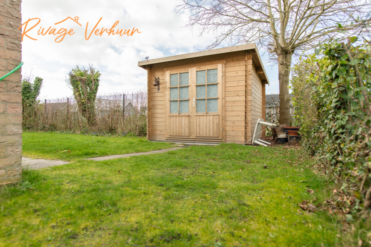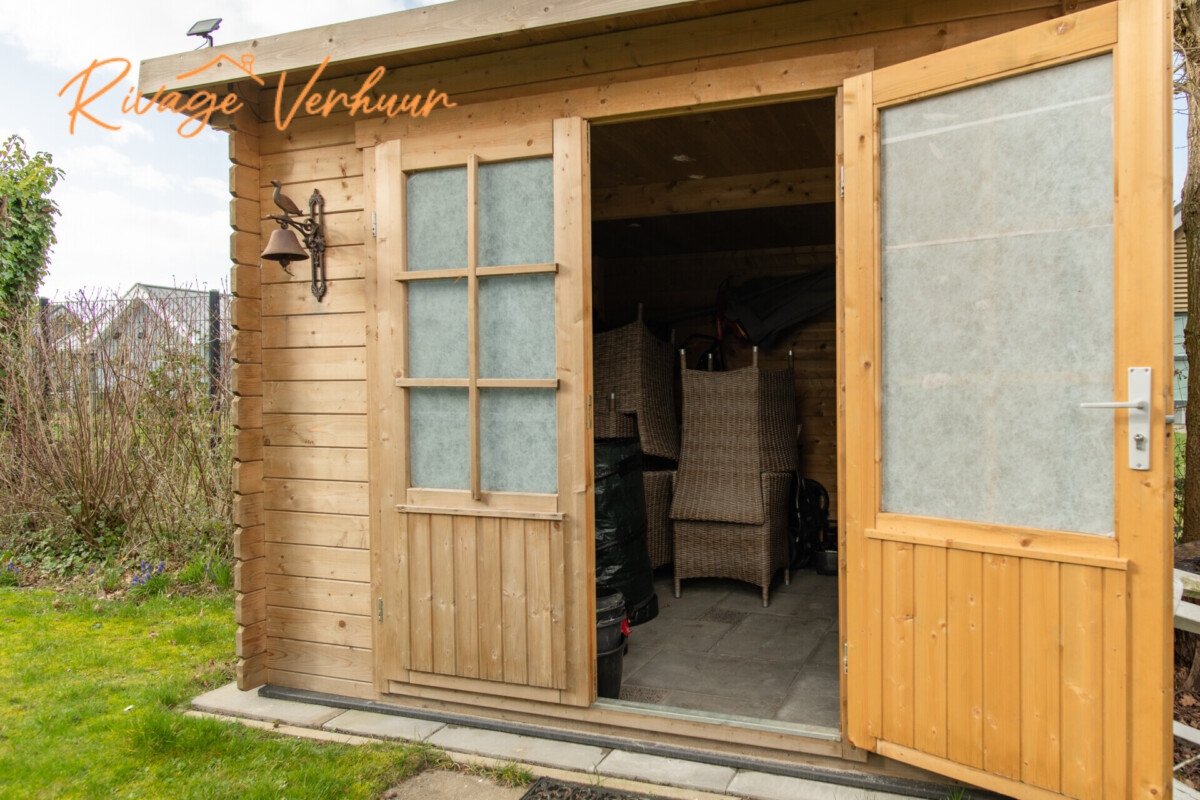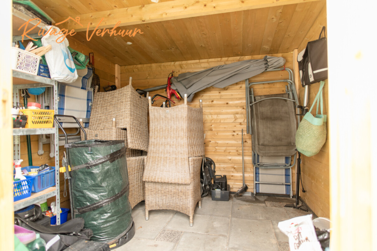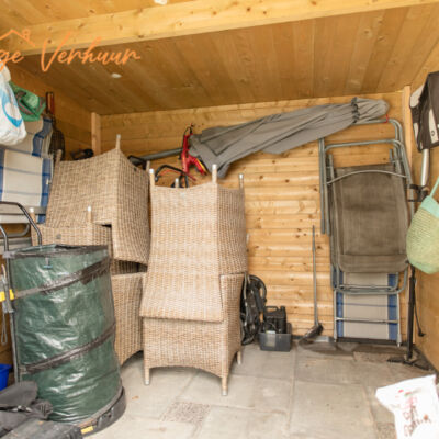 Na de keuken en bijkeuken kun je via de “achterdeur” naar buiten waar een ruim tuinhuis beschikbaar is voor fietsen of iets anders. Deze vrijstaande recreatiewoning staat midden op het ruime perceel van 340 vierkante meter eigen grond. Je kan dus overal in de zon of schaduw zitten afhankelijk van het weer en het moment van de dag.