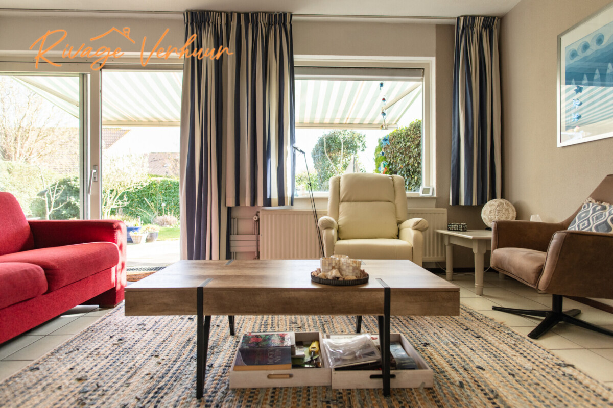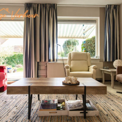 Achter de voordeur schuilt een gang met deuren naar een slaapkamer, een badkamer, een gastentoilet en de woonkamer. Ook de opgaande trap naar de eerste verdieping is in deze gang te vinden. In de woonkamer bevindt zich een romantische houtkachel, een zithoek, tv-gedeelte en een eethoek. Vanuit de woonkamer kan je via de schuifpui het terras bereiken.